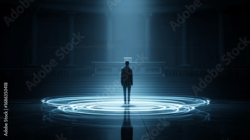 A defendant's silhouette in a courtroom, surrounded by glowing rings of light symbolizing legal protection.
