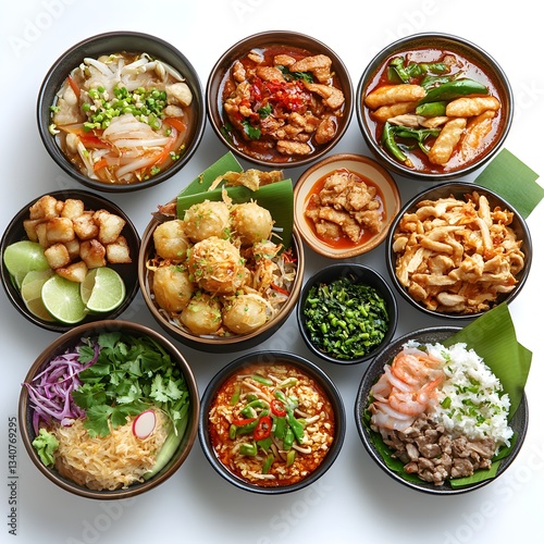 A delectable array of Asian cuisine dishes including noodles, rice, curries, and various appetizers is presented in dark bowls on a white background.