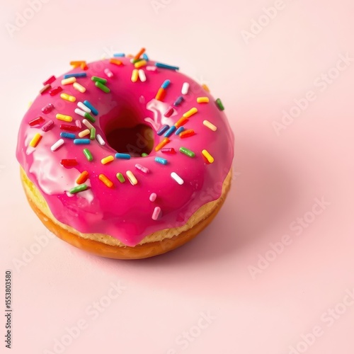 A delectable baked donut, adorned with vibrant pink frosting and colorful sprinkles, sits on a soft pastel backdrop, sweetness, sweet treat