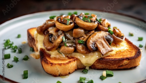a delectable close up of gourmet cheese toast topped with sauteed mushrooms and onions reflecting the appetizing allure of savory culinary creations on a plate
