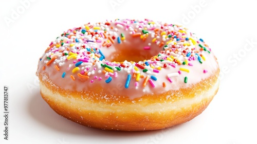 A delectable doughnut, adorned with a sugary glaze and an array of vibrant sprinkles, stands out against a pristine white backdrop.
