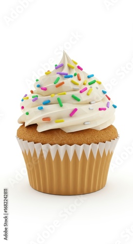 A delectable, light-cream-topped cupcake, adorned with colorful sprinkles, is showcased against a plain white background.