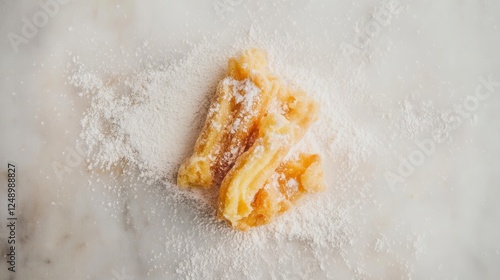 A delectable pastry dusted with powdered sugar rests elegantly on a table, inviting indulgence and delight for dessert lovers.