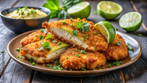 A delectable photograph showcasing crispy baked chicken breasts smothered in a rich, creamy, melted cheese sauce with fresh parsley sprinkles.