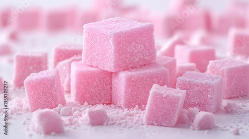 A delectable pile of pink sugar cubes rests on a white surface surrounded by more scattered cubes and a fine pink sugar dust.