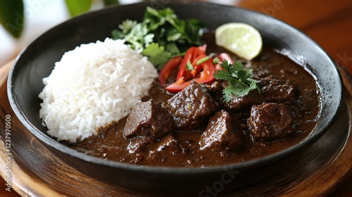 A delectable plate of traditional savory beef stew served with fragrant jasmine rice, fresh herbs, and lime garnish showcasing a rich culinary heritage and flavor profile.