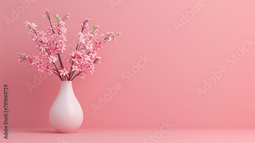 A delicate array of pink spring flowers displayed in a graceful white vase set against a soft pink backdrop.