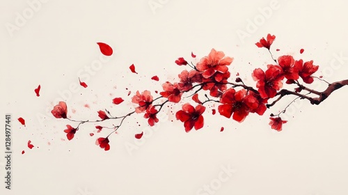 A delicate branch of red flowers with petals floating in the air, evoking beauty and tranquility.