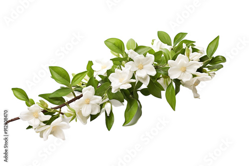 A Delicate Branch of White Gardenia Blossoms in Full Bloom on a White or Clear Surface PNG Transparent Background