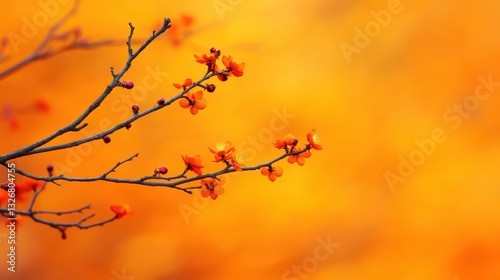A delicate branch with bright orange flowers stands out against a warm, blurred orange background, evoking a sense of tranquility and autumn beauty.