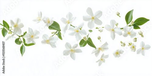 A delicate display of white jasmine flowers and green leaves set against a clean white background, highlighting the purity and elegance of the blossoms in a minimalist style.