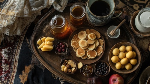 A delicate Eid-themed breakfast spread featuring mini pancakes
