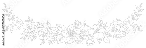 A delicate floral arrangement featuring outlined blossoms and leaves in a symmetrical curved design on white