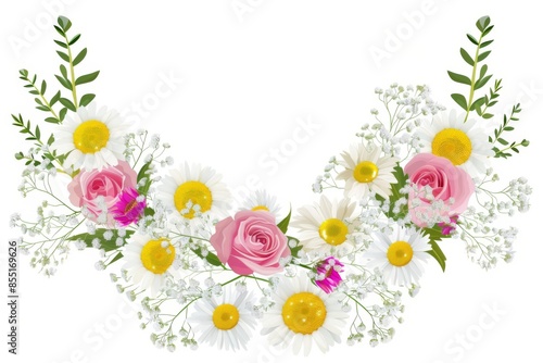 A delicate floral crown adorned with freshly picked flowers, perfect for a summer festival. The illustration features daisies, roses, and baby's breath in a beautiful arrangement.