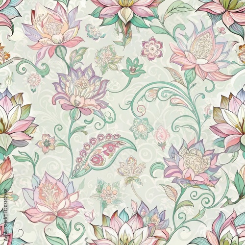 A delicate floral pattern featuring pastel-colored lotus flowers and intricate vines on a soft background.