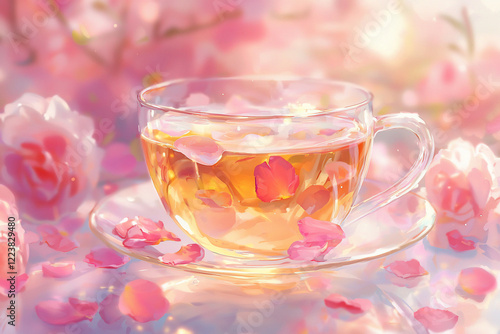 A delicate glass cup filled with floral tea, surrounded by pink rose petals in a serene garden setting