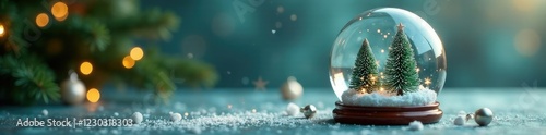 A delicate glass globe filled with mini pine trees, snowflakes, and sparkling ornaments, snowflakes, decoration, pine