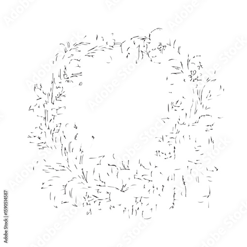 A delicate handdrawn floral wreath with leaves and small flowers, creating an organic circular frame