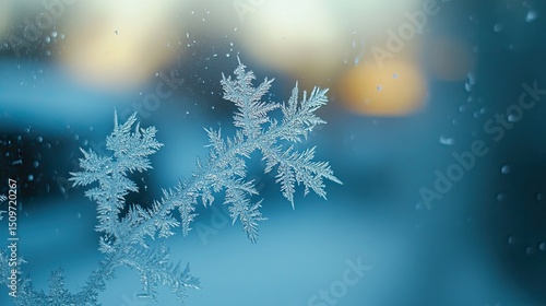 A delicate ice crystal adorns a window pane a fleeting masterpiece born of winter s embrace with a soft focus and cool