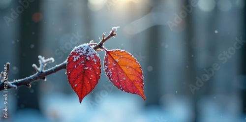 A delicate leaf clings to a branch as winter's grip tightens, wintry forest, frosty nature, winter weather
