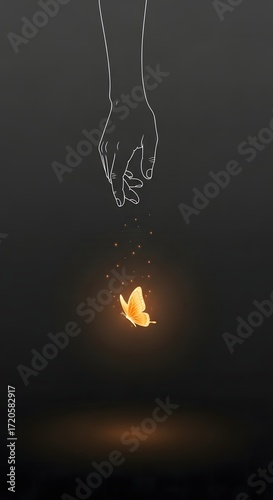 A delicate line-drawn hand reaches towards a single, magical, glowing golden butterfly, symbolizing hope, freedom, gentleness, and the beauty of letting go