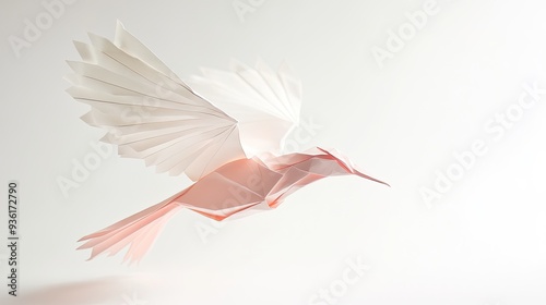 A delicate origami paper bird appears to be in mid-flight, set against a clean white background. The crisp folds and soft colors of the paper create a serene and artistic image