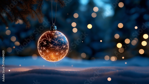 A delicate ornament with glowing patterns dangles from a snow-covered pine branch, set against a backdrop of softly illuminated lights in a peaceful winter setting.
