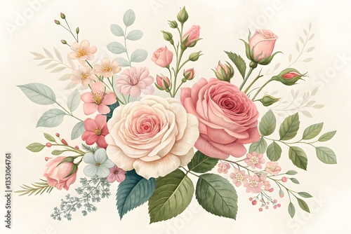 A delicate, pastel-colored floral illustration featuring roses, leaves, and small blossoms in a vintage botanical style.
