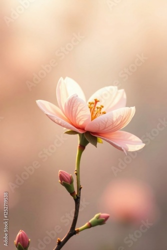 A Delicate Pink Blossom in Soft Golden Light, Gracefully Emerging from Budding Branches