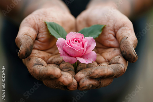 A Delicate Pink Rose Held in Loving, Dirt-Covered Hands: A Symbol of Growth, Beauty, and the Gardener's Touch World Cancer Day.