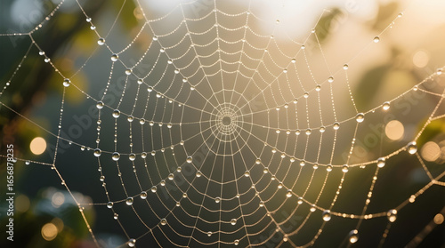 A delicate spiderweb is adorned with glistening dew drops, sparkling in the warm, golden sunlight.