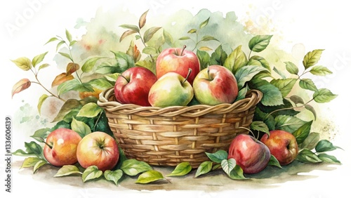 A delicate watercolor illustration of a wicker fruit basket overflowing with fresh apples, surrounded by lush greenery and vines