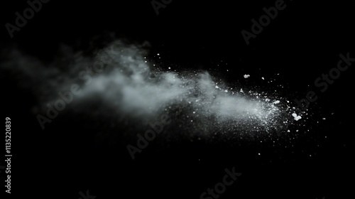 A delicate white dust cloud spreading across a pitch-black background, with fine particles floating and creating an ethereal and mysterious visual effect