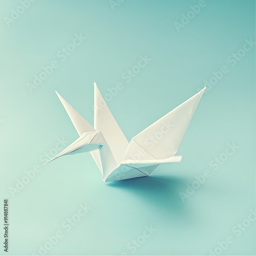 A delicate white origami crane on a soft blue background, symbolizing peace and tranquility in paper art.
