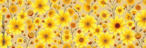 A delicate yet striking seamless pattern featuring a mix of yellow flowers with varying shapes and sizes, garden theme, yellow flowers pattern