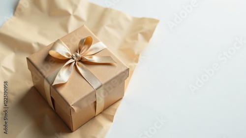 A delicately tied golden ribbon adorns a kraft paper gift box, resting on a crumpled sheet of matching paper, suggesting a moment of thoughtful preparation and anticipation.