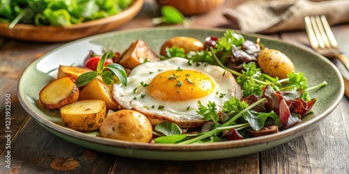 A Delicious and Wholesome Fried Egg Breakfast Bowl with Roasted Potatoes and a Fresh Green Salad