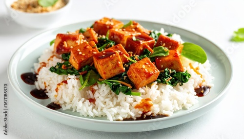 A delicious Asian-inspired dish of crispy glazed tofu and wilted spinach served over a bed of fluffy white rice, a healthy vegan meal