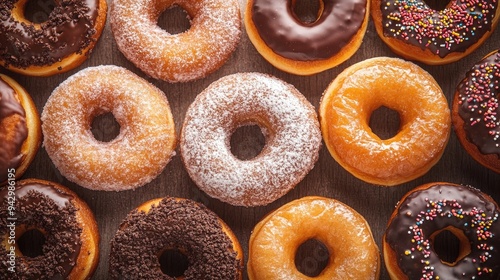 A delicious assortment of doughnuts with icing sugar, including chocolate and glazed varieties with sprinkles