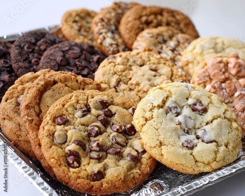 A delicious assortment of freshly baked cookies featuring chocolate chips, nuts, and various flavors.