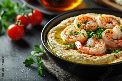 A delicious bowl of hummus generously topped with succulent shrimp and garnished with fresh herbs and spices, set against a dark and textured background.