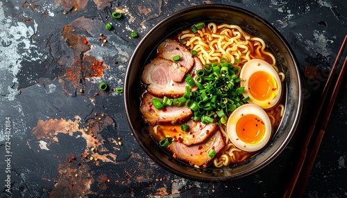 A delicious bowl of Japanese ramen noodle soup with tender pork, soft boiled egg, and green onions on a rustic dark background