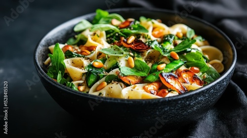 A delicious bowl of pasta salad filled with colorful vegetables and seasoned with nuts, showcasing a healthy, vibrant meal that emphasizes freshness and culinary creativity.