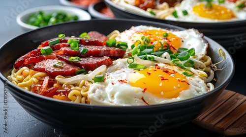 A delicious bowl of ramen featuring soft-boiled eggs, sliced sausage, and green onions, creating a vibrant and appetizing meal.