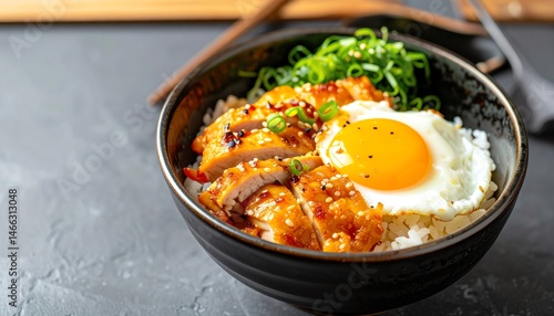 A delicious bowl of rice topped with grilled chicken, a fried egg, and green onions, garnished with sesame seeds