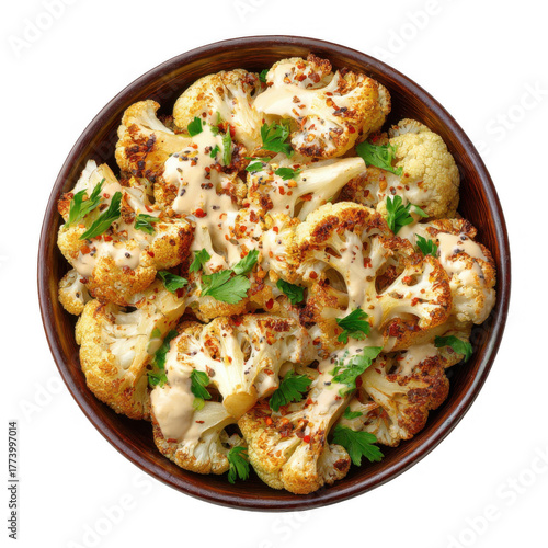 A delicious bowl of roasted cauliflower topped with a creamy dressing fresh herbs and spicy red pepper flakes