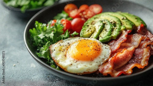 A delicious breakfast bowl featuring a fried egg, crispy bacon, fresh avocado, tomatoes, and greens, perfect for a nutritious meal.