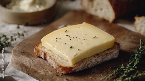 A delicious cheese slice placed on warm toasted bread, perfect for a savory snack or quick meal, shot in a cozy setting.