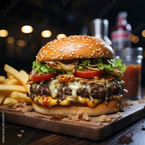 A Delicious Cheeseburger with Fries and Condiments on a Table