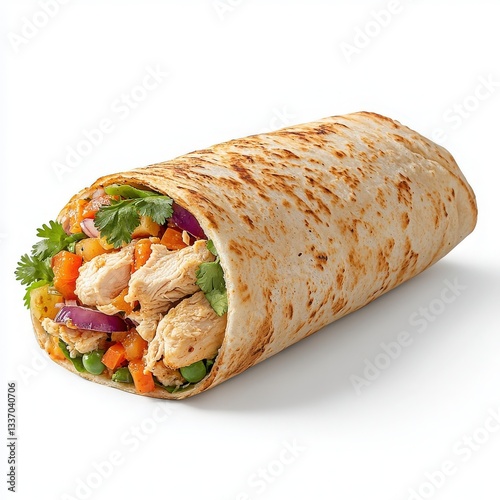 A delicious chicken and vegetable burrito wrapped in a toasted tortilla, perfect for a quick and healthy meal.